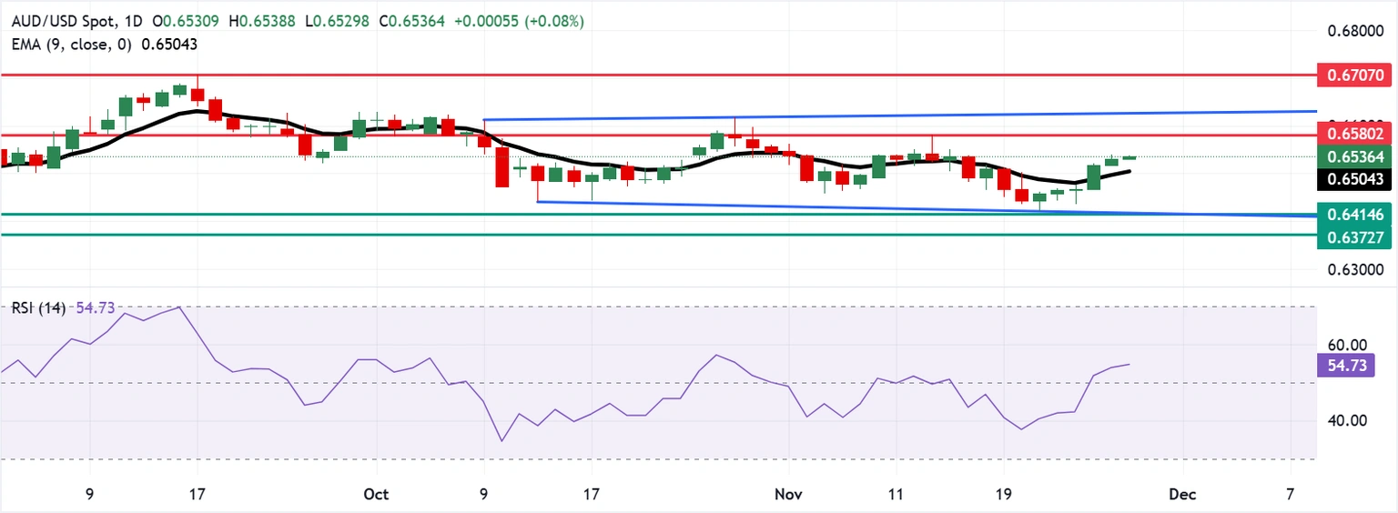 AUD/USD giao dịch quanh 0.6540 trong phiên thứ Sáu. Phân tích kỹ thuật khung ngày cho thấy cặp tiền này đang di chuyển trong vùng tích lũy hình chữ nhật, phản ánh xu hướng trung lập. Việc vượt lên trên đường EMA 9 ngày cho thấy động lực tăng ngắn hạn đang được củng cố.