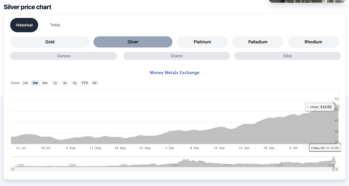 Từ góc độ kỹ thuật, một tài sản được xem là bị mua quá mức khi giá tăng quá nhanh so với xu hướng gần đây. Vào ngày 18 tháng 9, bạc được giao dịch ở mức 41.83 USD. Trong ba tuần kế tiếp, giá đã tăng lên 54.32 USD mỗi ounce, tương đương mức tăng 29.6%. Sau đó, giá điều chỉnh nhẹ về 52 USD vào thứ Sáu, nhưng đến thứ Hai, phe mua đã lấy lại quyền kiểm soát, đẩy bạc lên 52.75 USD. Việc giá tăng mạnh trong thời gian ngắn chính là biểu hiện điển hình của tình trạng mua quá mức. Tuy nhiên, đợt tăng giá này được hỗ trợ bởi các yếu tố cơ bản vững chắc, cho thấy đây không phải là hiện tượng tăng nóng thiếu bền vững.