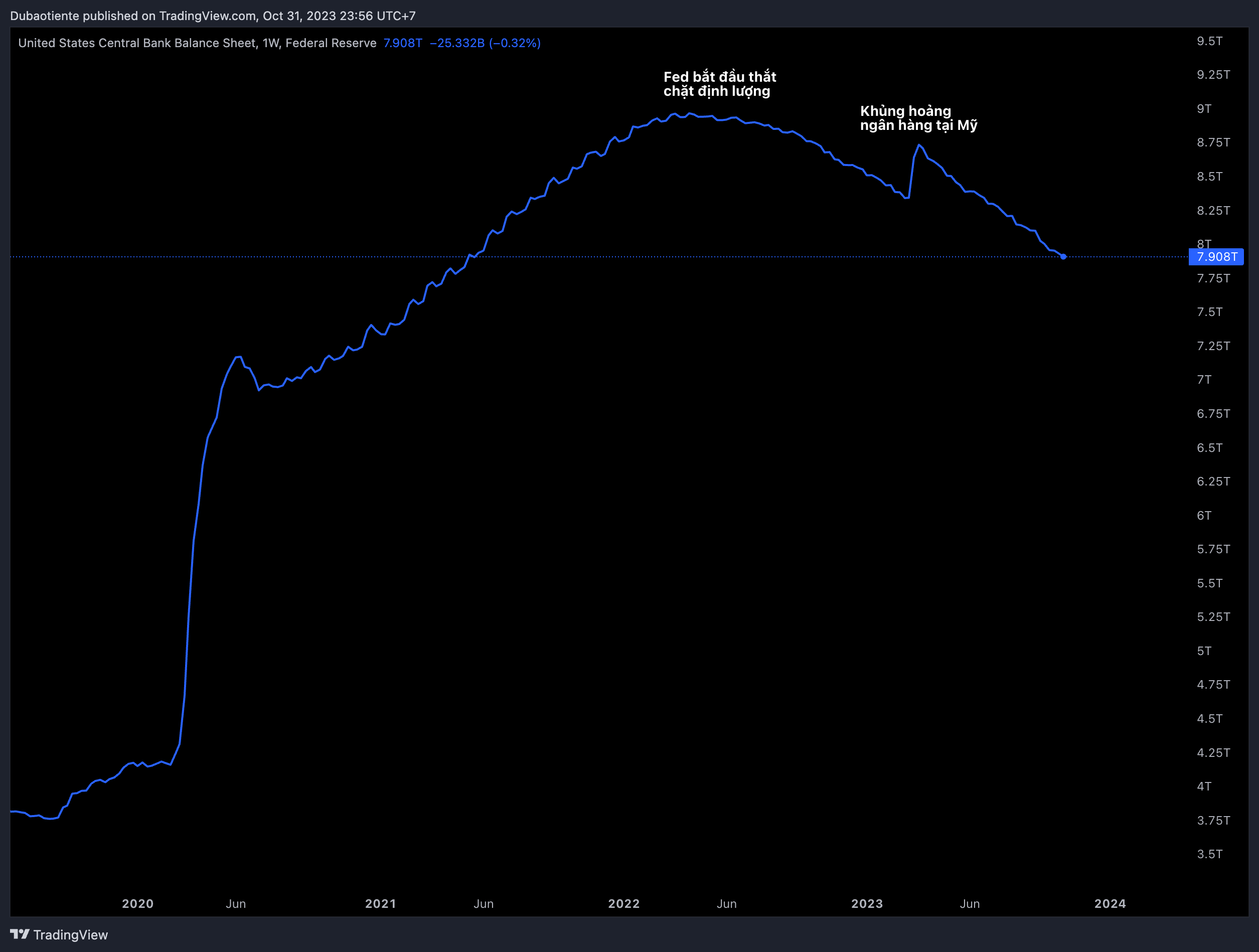 Lần thứ hai Fed quyết định thắt chặt định lượng là khoảng thời gian từ tháng 3/2022. Tại thời điểm này, Bảng cân đối kế toán của Fed đã tăng lên gần $9,000 tỷ do các hoạt động mua tài sản rầm rộ để chống lại đại dịch COVID-19 năm 2020.