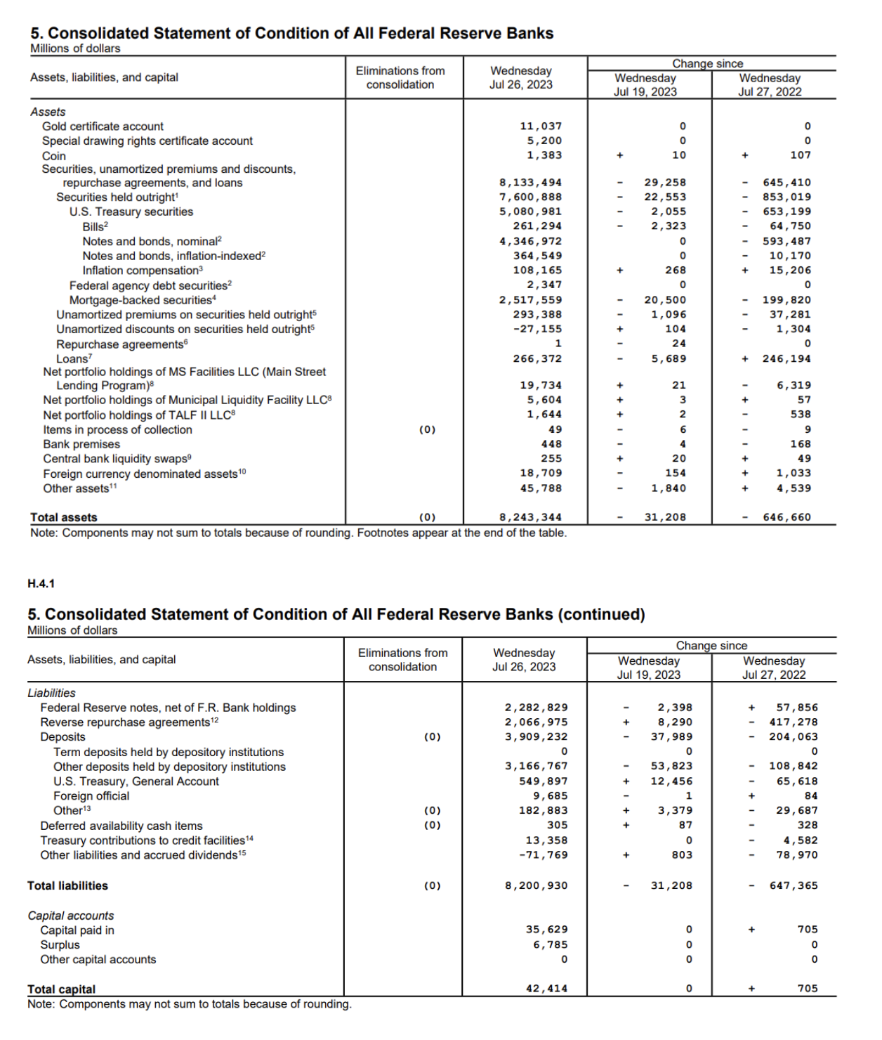 Ví dụ về một bảng cân đối kế toán của Fed được phát hành vào ngày 24/7/2023. Tính đến thời điểm đó: