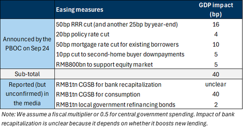 Mặc dù có nhiều tin đồn và báo cáo về các biện pháp cải cách tài khóa quy mô lớn của Trung Quốc (bao gồm khoản nợ chủ quyền trị giá 284 tỷ USD và khoản bơm vốn 142 tỷ USD vào các ngân hàng lớn), nhưng cho đến nay chưa có cải cách nào thực sự được thực hiện. Dù vậy, các nhà kinh tế của Goldman Sachs dự báo rằng chính phủ Trung Quốc có thể sẽ phát hành thêm trái phiếu đặc biệt rất dài hạn với giá trị từ 1 đến 2 nghìn tỷ RMB.