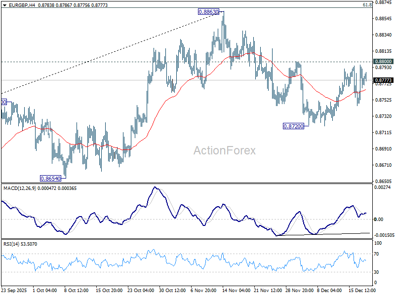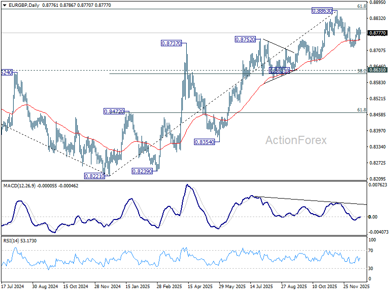 Về mặt kỹ thuật, diễn biến giá cho thấy nhịp điều chỉnh giảm của EUR/GBP từ 0.8863 có thể đã kết thúc tại 0.8720, nhờ lực hỗ trợ từ EMA 55 ngày. Nếu giá vượt dứt khoát 0.8800, xu hướng tăng sẽ được củng cố và cho thấy đà tăng từ 0.8221 đang tiếp diễn, với khả năng vượt lại 0.8863. Ngược lại, nếu không vượt được 0.8800, cặp tiền có thể quay đầu giảm trở lại, xuyên qua 0.8720 và hướng về vùng hỗ trợ 0.8631.