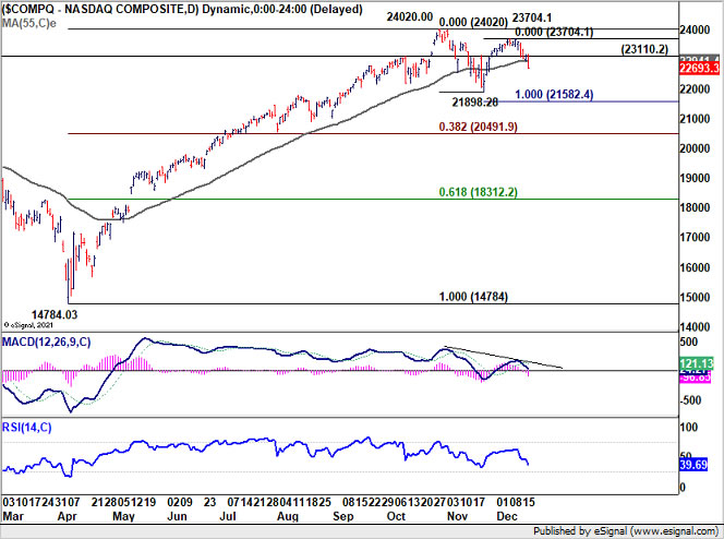 Về kỹ thuật, việc NASDAQ phá vỡ vùng hỗ trợ 23,110.2 cùng EMA 55 ngày cho thấy mô hình điều chỉnh từ đỉnh 24,020.0 đang bước sang nhịp giảm thứ ba. Chỉ số có thể tiếp tục giảm về vùng hỗ trợ 21,898.2, thậm chí sâu hơn, xuống mức mục tiêu kỹ thuật quanh 21,582.4.