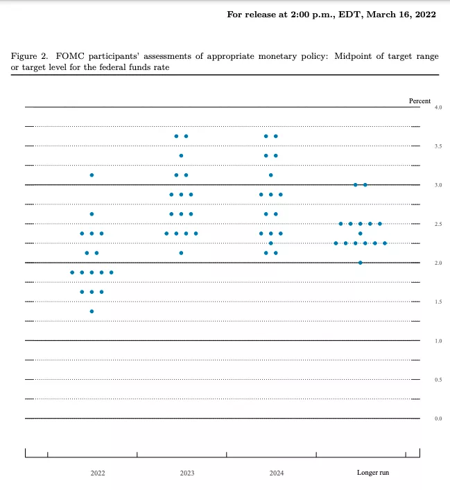 Khi bạn nhìn vào biểu đồ của FOMC, mỗi chấm đại diện cho quan điểm của một thành viên về phạm vi mà lãi suất nên ở vào thời điểm đó. Chấm của họ nằm ở trung tâm của phạm vi đó. Nói cách khác, không nên giả định rằng các chấm đại diện cho việc một thành viên đang nhắm đến một con số cụ thể đó. Quan trọng là không biết chấm nào thuộc về thành viên FOMC nào.