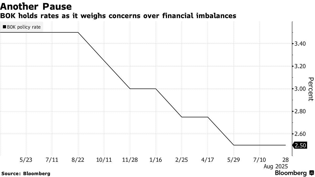 Sau bốn lần giảm lãi suất kể từ tháng Mười năm ngoái khi họ bắt đầu chu kỳ nới lỏng hiện tại, các nhà hoạch định chính sách đã tạm dừng trong hai cuộc họp liên tiếp vào tháng Tám, nhận thức được các rủi ro từ giá căn hộ tăng cao ở khu vực Greater Seoul và mức nợ hộ gia đình cao.