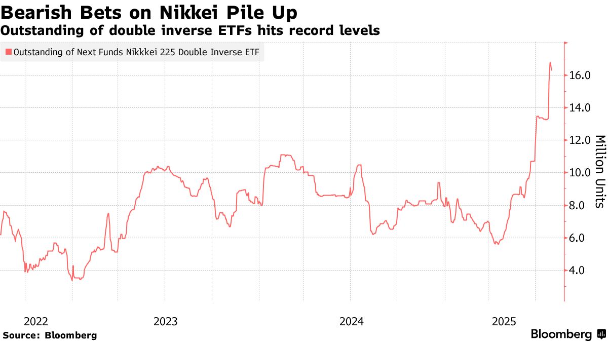 Số lượng nắm giữ của ETF Nikkei 225 Double Inverse — một sản phẩm đòn bẩy phổ biến tăng giá khi thị trường giảm — đã tăng lên mức kỷ lục 16.8 triệu đơn vị trong tuần này, gấp ba lần so với mức thấp giữa tháng Tư là 5.6 triệu đơn vị.