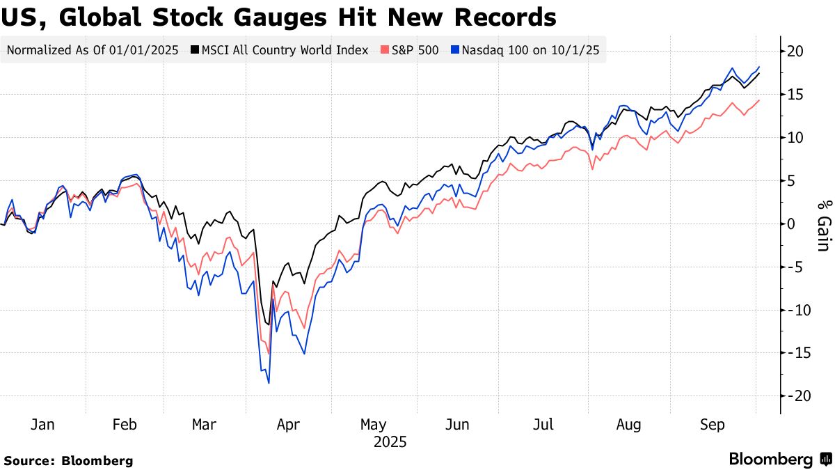 Sự bùng nổ trí tuệ nhân tạo và hàng tỷ đô la đầu tư doanh nghiệp đã là động lực chính của đà tăng cổ phiếu lên mức cao kỷ lục sau sự sụt giảm tháng Tư. Các nhà đầu tư cũng đã bỏ qua tình trạng bế tắc chính trị ở Washington dẫn đến lần đóng cửa chính phủ đầu tiên trong bảy năm và đe dọa cản trở dữ liệu kinh tế quan trọng mà Fed cần cho các quyết định lãi suất.