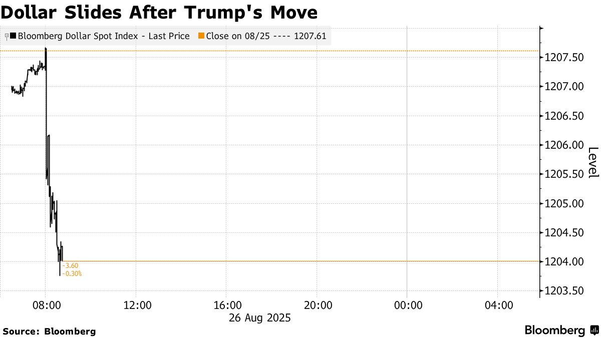 Đồng USD suy yếu và các tài sản trú ẩn an toàn truyền thống tăng giá sau khi Tổng thống Donald Trump có động thái loại bỏ Thống đốc Fed Lisa Cook, làm dấy lên lo ngại về tính độc lập của ngân hàng trung ương.
