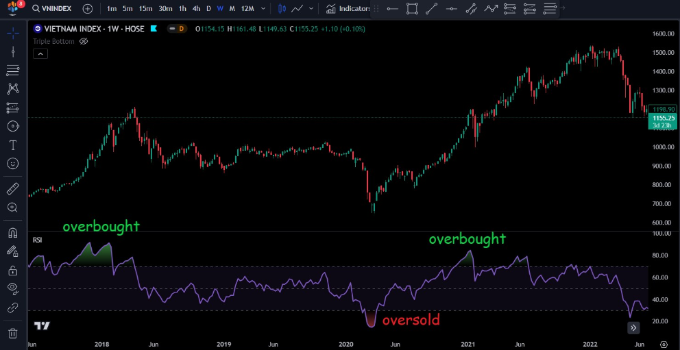 - Hiện tượng quá bán (oversold): RSI sẽ cắt qua trục 30 và đi xuống. Các nhà đầu tư có thể kỳ vọng giá điều chỉnh tăng trở lại.