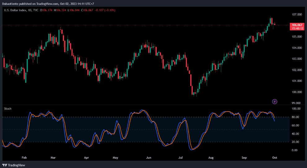 Thứ hai, chỉ báo Stochastic: là chỉ báo dao động được sử dụng để đo lường tốc độ biến động (nhanh chậm) của tài sản. Tức là, so sánh mức giá hiện tại với một phạm vi giá trong một khoảng thời gian nhất định (thường là 14 phiên gần nhất), từ đó tính toán tốc độ thay đổi của giá so với kỳ vọng hay giá trị thực tế.
