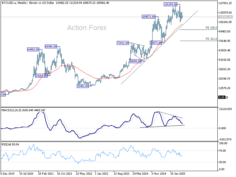 Mô hình tích lũy từ 101,896 dường như đã hoàn tất trong ba sóng lên đến 116,405, cho thấy đà giảm từ 126,289 có thể tiếp tục. Việc xuyên thủng 106,230 sẽ xác nhận động lượng giảm mới, mở đường về lại 101,896 ban đầu.