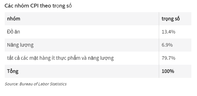 Bảng dưới đây biểu thị phân phối trọng số của rỏ CPI cho thực phẩm, năng lượng và tất cả các mặt hàng khác.