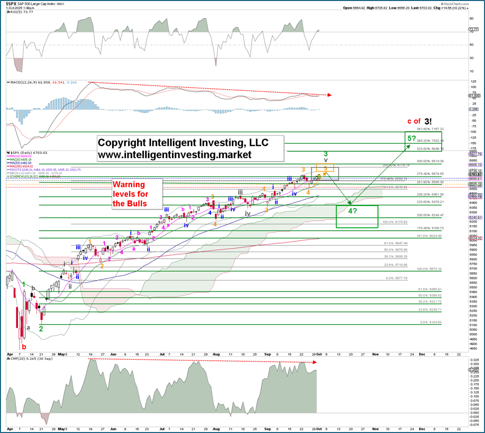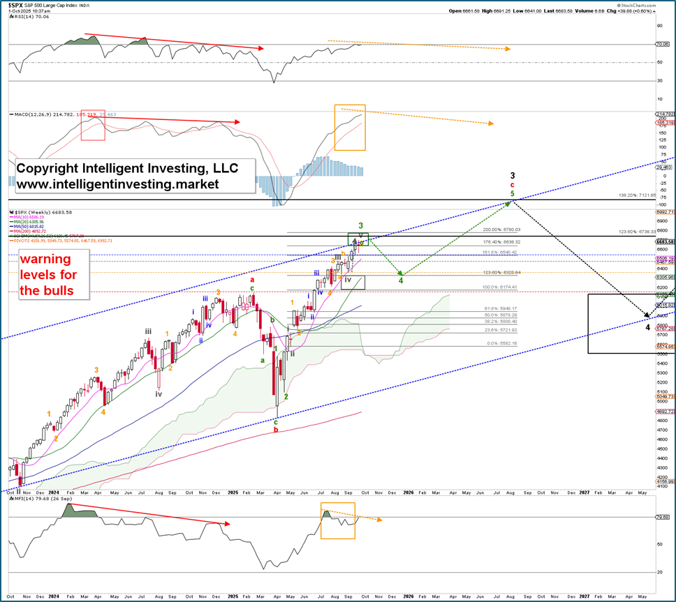 Trong các cập nhật gần đây, chúng tôi đã theo dõi một nhịp tăng lên vùng SPX 6,690+/10, từ đó kỳ vọng một đợt pullback 3-5% trước khi đợt tăng tiếp theo hướng đến khoảng SPX 7,120. Chỉ số đạt đỉnh tại SPX 6,699 vào ngày 23/9, sau đó giảm về SPX 6,569 vào ngày 25/9 và hiện đang dao động quanh đáy 6,700.