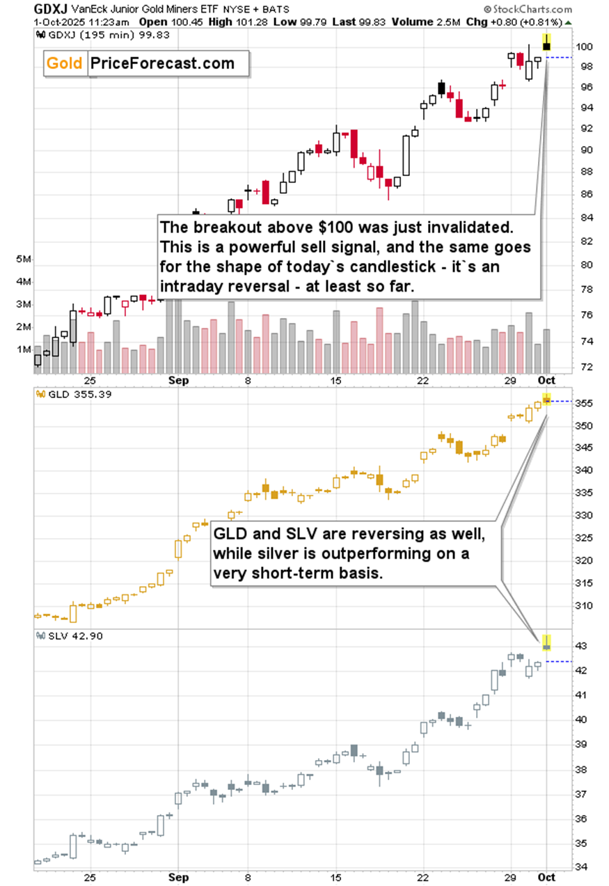 Cả vàng, bạc và nhóm khai thác đều đảo chiều. Đáng chú ý, GDXJ đã vô hiệu hóa một pha bứt phá nhỏ lên trên ngưỡng tròn $100 – một trong những mốc quan trọng nhất. Đây là dấu hiệu bán rõ rệt. Nếu GDXJ đóng cửa dưới $100 trong hôm nay (một kịch bản có xác suất cao), tín hiệu bán mạnh sẽ được xác nhận.