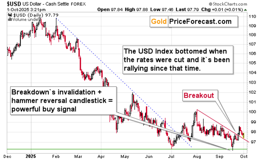 Từ góc độ kỹ thuật, diễn biến của USD là tín hiệu tích cực: chỉ số này vừa xác nhận phá vỡ lên trên đường kháng cự đỏ đang dốc xuống.