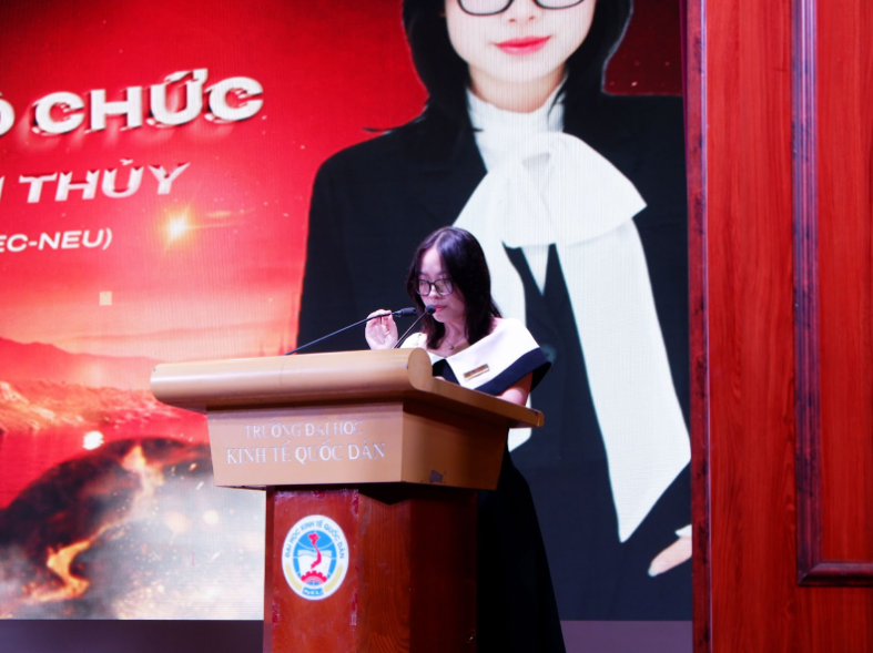 Chị Minh Thủy - Chủ nhiệm CLB Nhà Kinh tế trẻ (YEC-NEU) cùng lời phát biểu