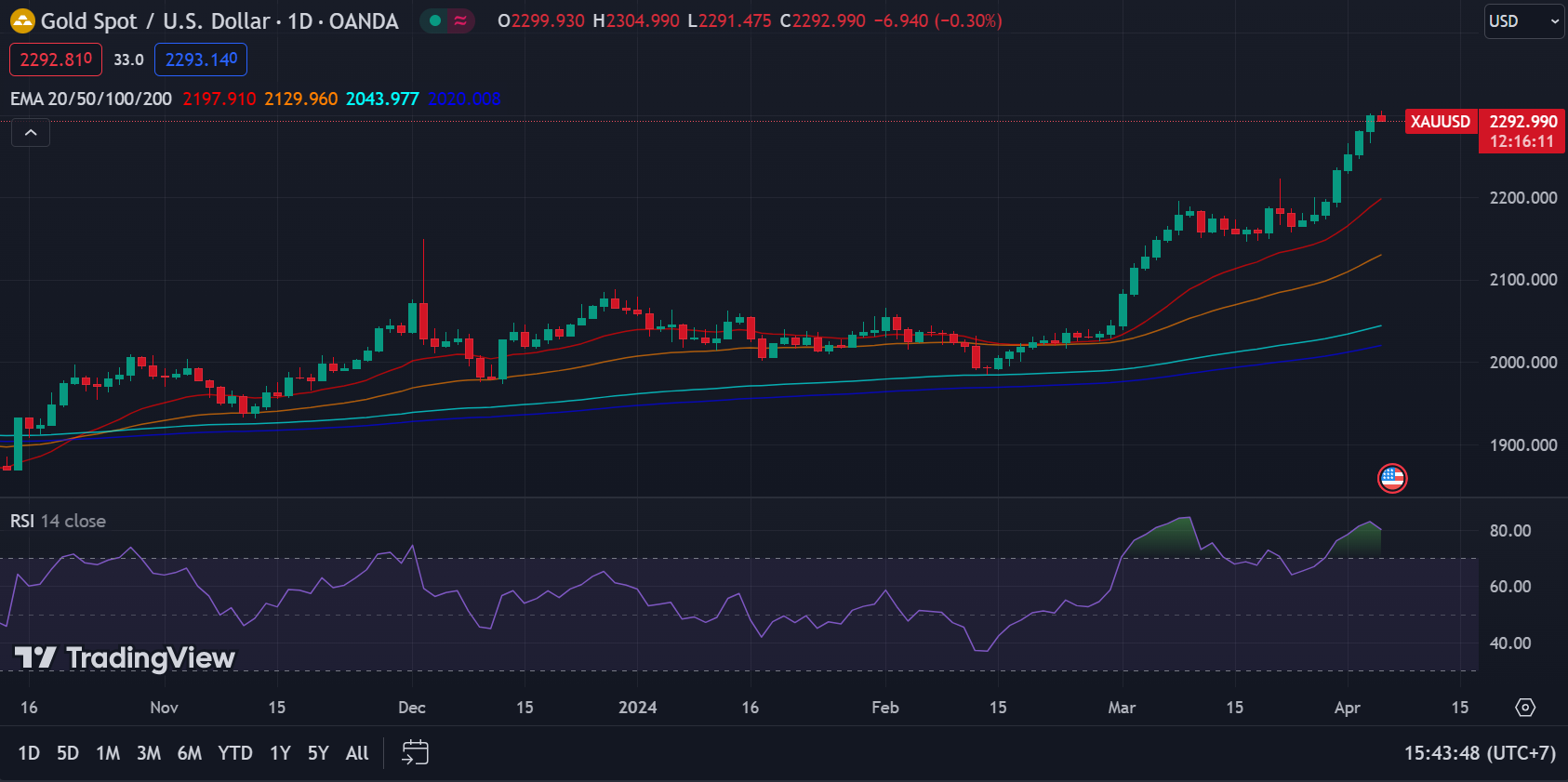 - Nguy cơ chiến tranh Israel - Hamas lan rộng sang Iran và bùng phát thành cuộc xung đột lớn hơn ở Trung Đông đã đẩy giá vàng lên mức cao nhất từ trước đến nay, đạt mốc $2,300 tính đến hiện tại.