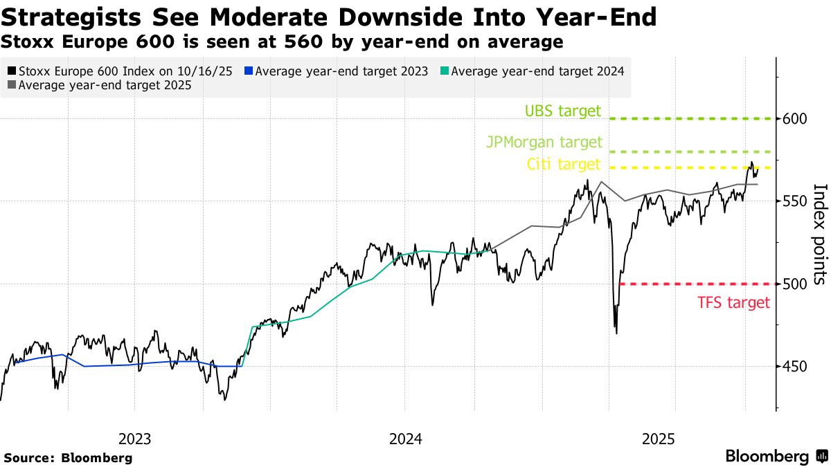 Một cuộc khảo sát của Bloomberg với 18 chiến lược gia cho thấy chỉ số Stoxx Europe 600 được dự báo sẽ giao dịch ở mức trung bình 560 điểm vào cuối năm. Con số này không thay đổi so với cuộc khảo sát tháng trước của Bloomberg Terminal và ngụ ý mức giảm khoảng 1% so với mức đóng cửa vào thứ Tư. Societe Generale cho rằng chỉ số chuẩn có thể giảm xuống 530, trong khi Citi dự báo ở mức 570.