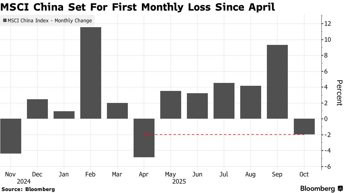 Chỉ số MSCI China đã giảm 2.5% trong tháng Mười, chấm dứt chuỗi tăng trưởng kéo dài năm tháng. Mức giảm này thấp hơn đáng kể so với mức tăng 4.2% của chỉ số MSCI Asia Pacific.