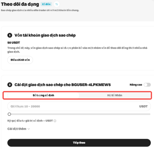 b. Nếu có số vốn đầu tư, người dùng có thể chọn Số tiền Cố định hoặc Hệ số nhân để thực hiện các giao dịch sao chép.