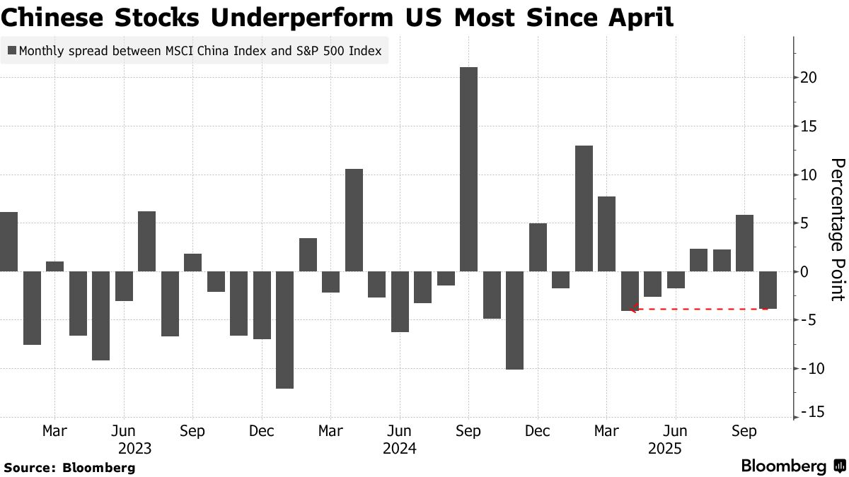 Cổ phiếu Trung Quốc, vốn đã tăng mạnh trong phần lớn năm nay, đã mất đà trong những tuần gần đây. Chỉ số MSCI China giảm khoảng 3.9% trong tháng này, tụt hậu xa so với mức tăng 2.3% của chỉ số MSCI Asia Pacific. Trung Quốc cũng đang có kết quả kém hơn thị trường chứng khoán Mỹ nhiều nhất kể từ khi tranh chấp thương mại hồi tháng 4 làm rung chuyển các thị trường toàn cầu.