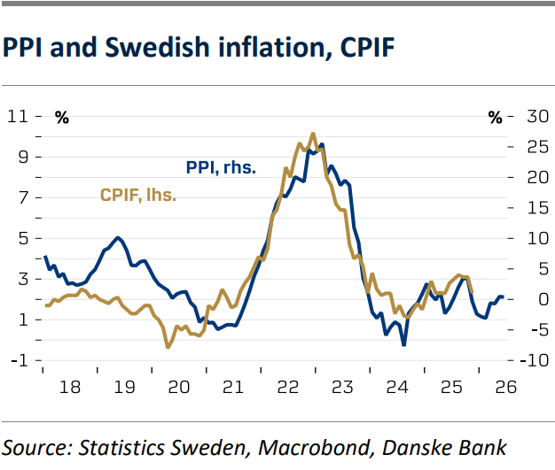Tại Thụy Điển, chỉ số giá sản xuất (PPI) tháng 11 sẽ được công bố vào thứ Ba. PPI là chỉ báo sớm quan trọng đối với lạm phát tại Thụy Điển. Trong tháng 10, PPI tăng 0.4% y/y và 0.4% m/m. Trong bối cảnh bất định gia tăng về lạm phát năm tới, một phần do thay đổi cấu phần chỉ số (chuyển từ COICOP1999 sang COICOP2018), việc theo dõi sát áp lực giá cơ bản trở nên đặc biệt quan trọng. Dữ liệu lạm phát sẽ được công bố vào ngày 8 tháng 1. Danske Bank cho rằng mức giảm của gói du lịch trong tháng 11 chỉ mang tính tạm thời và sẽ phục hồi một phần. Lạm phát lõi tháng 12 được kỳ vọng ở mức 2.6% y/y, trong khi giá năng lượng thấp do mùa đông ôn hòa sẽ kéo CPIF về khoảng 2.5% y/y.