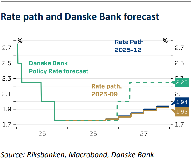 Riksbank giữ nguyên lãi suất chính sách ở mức 1.75%, đúng như kỳ vọng rộng rãi, và lộ trình lãi suất ngắn hạn cũng không thay đổi. Ở phần cuối của lộ trình, ngân hàng có điều chỉnh tăng nhẹ, với điểm kết thúc mới vào quý 4 năm 2028 ở mức 2.12%. Mức điều chỉnh này thấp hơn kỳ vọng của các nhà phân tích nhưng cho thấy những bước đi thận trọng hướng tới bình thường hóa chính sách. Các chuyên gia vẫn giữ quan điểm Riksbank sẽ tăng lãi suất vào tháng 12 năm 2026, sau đó là tháng 3 năm 2027, đưa lãi suất lên 2.25%. Dự báo vĩ mô được điều chỉnh theo hướng tích cực hơn, phù hợp với kỳ vọng, khi nhu cầu nội địa dẫn dắt quá trình phục hồi và tiêu dùng hộ gia đình tăng trưởng song hành với thu nhập thực. Thị trường lao động cải thiện và lạm phát, sau điều chỉnh thuế, được kỳ vọng ở gần mức 2% trong năm tới. Nhìn chung, dự báo mới của Riksbank khá sát với dự báo của Danske Bank ngày 3 tháng 12, ngoại trừ tỷ lệ thất nghiệp được kỳ vọng giảm mạnh hơn do giả định khác biệt về tỷ lệ tham gia lực lượng lao động.