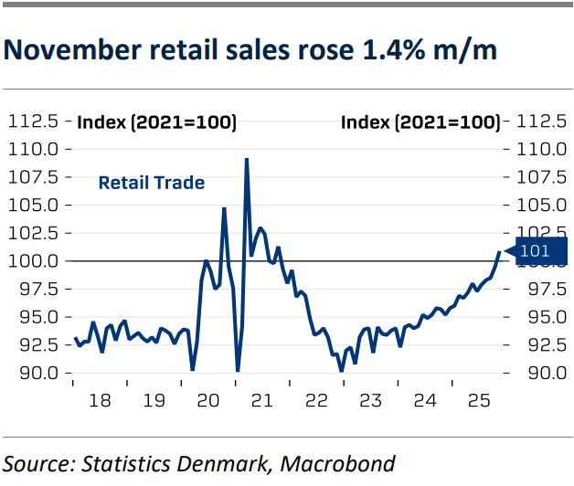 Doanh số bán lẻ tăng 1.4% m/m trong tháng 11 sau điều chỉnh mùa vụ và lạm phát, với mức tăng ghi nhận trên tất cả các nhóm hàng. Diễn biến này phù hợp với báo cáo Spending Monitor gần nhất của Danske Bank, cho thấy chi tiêu bán lẻ thực tế tăng 1.3% m/m trong tháng 11. Theo Cơ quan Thống kê Đan Mạch, doanh số quần áo tăng 2.7%, các mặt hàng tiêu dùng khác tăng 1.6%, trong khi thực phẩm và hàng thiết yếu tăng 1.1%. Dù tháng 11 vẫn là tháng mua sắm quan trọng, tỷ trọng trong doanh số cả năm đã giảm nhẹ so với các năm trước, với các nhóm quà tặng truyền thống như đồ gia dụng và sách đóng góp ít hơn.