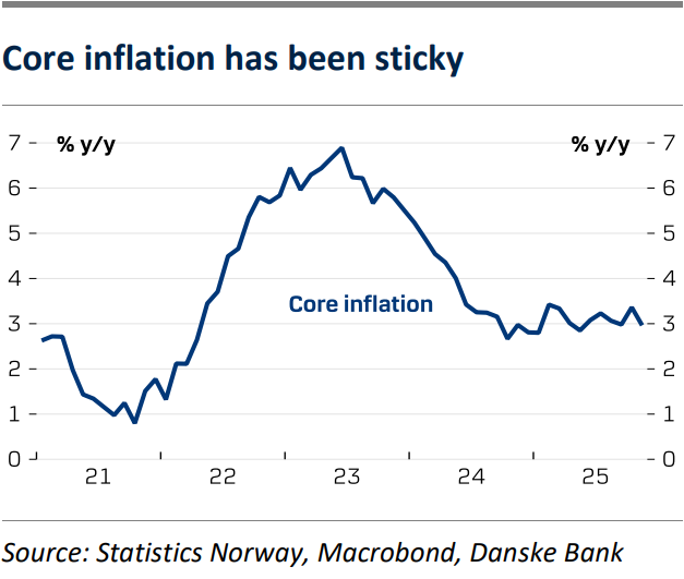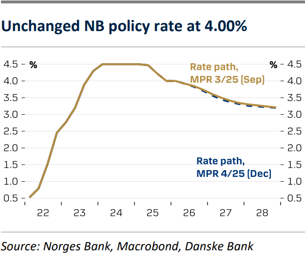 Đúng như dự báo, Norges Bank giữ nguyên lãi suất chính sách ở mức 4.00%, đồng thời nhấn mạnh rằng “triển vọng còn bất định, nhưng nếu nền kinh tế diễn biến phù hợp với dự báo hiện tại, lãi suất chính sách sẽ tiếp tục được giảm trong năm tới.” Cụ thể, lộ trình lãi suất cho thấy xác suất cao cho đợt cắt giảm đầu tiên vào quý 2, với tổng cộng 1–2 lần cắt giảm trong năm. Tăng trưởng trong nước được điều chỉnh giảm, qua đó kéo lộ trình lãi suất đi xuống, cùng với áp lực giá và tiền lương suy giảm và kỳ vọng chênh lệch Nibor tăng cao. Ngược lại, dự báo tăng trưởng toàn cầu và mặt bằng lãi suất quốc tế được điều chỉnh tăng, tạo lực kéo theo hướng ngược lại. Các yếu tố này nhìn chung phù hợp với kỳ vọng của Danske Bank, nhưng điểm bất ngờ lớn là mức độ mất giá của đồng krone cao hơn dự kiến. Với mức độ sử dụng công suất thấp hơn và tăng trưởng giá có phần suy yếu, nhu cầu giảm lãi suất có vẻ rõ ràng, song tỷ giá yếu đang hạn chế khả năng điều chỉnh chính sách theo điều kiện kinh tế trong nước. Dựa trên triển vọng kinh tế hiện tại, các nhà phân tích dự báo ba đợt cắt giảm lãi suất 25 bps trong năm 2026, vào tháng 6, tháng 9 và tháng 12, đưa lãi suất chính sách về khoảng 3.25% vào cuối năm 2026.