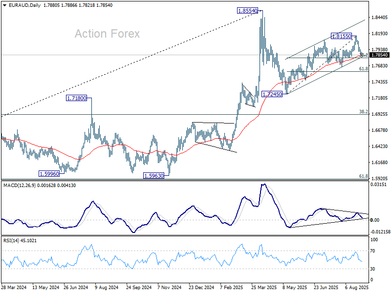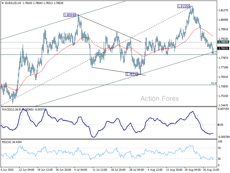 Đà giảm từ đỉnh ngắn hạn 1.8155 của EUR/AUD tiếp diễn hôm nay, với thiên hướng trong ngày vẫn nghiêng về giảm. Nếu phá vỡ dứt khoát mốc Fibonacci 38.2% của nhịp 1.7245–1.8155 tại 1.7807, điều này sẽ xác nhận toàn bộ nhịp tăng từ 1.7245 đã kết thúc. Khi đó, mô hình điều chỉnh từ đỉnh 1.8554 sẽ bước sang nhịp giảm thứ ba. Khả năng giảm sâu hơn xuống mốc Fibonacci 61.8% tại 1.7593. Ngược lại, vượt 1.7897 (kháng cự nhỏ) sẽ đưa thiên hướng ngắn hạn về trạng thái trung lập.