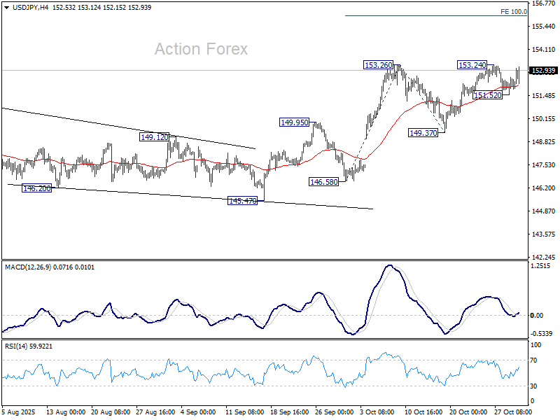 Đà phục hồi của USD/JPY từ 151.52 vẫn bị chặn dưới kháng cự 153.26, và xu hướng trong ngày hiện trung lập. Nếu phá vỡ chắc chắn mốc 153.26, xu hướng tăng lớn từ 139.87 sẽ được nối lại, với mục tiêu tiếp theo là 156.05 – mức mở rộng 100% của nhịp tăng 146.58 đến 153.26 từ 149.37. Tuy nhiên, nếu phá vỡ 151.52, mô hình điều chỉnh từ đỉnh 153.26 sẽ tiếp diễn với một nhịp giảm mới, hướng đến hỗ trợ 149.37.