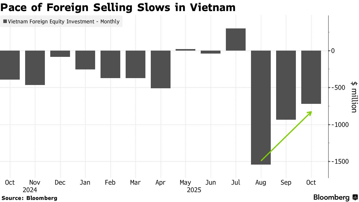 Các quỹ toàn cầu đã bán ròng 723 triệu USD cổ phiếu nội địa trong tháng này tính đến thứ Ba, giảm so với hơn 900 triệu USD trong tháng trước và mức kỷ lục 1.5 tỷ USD vào tháng 8, theo dữ liệu do Bloomberg tổng hợp.