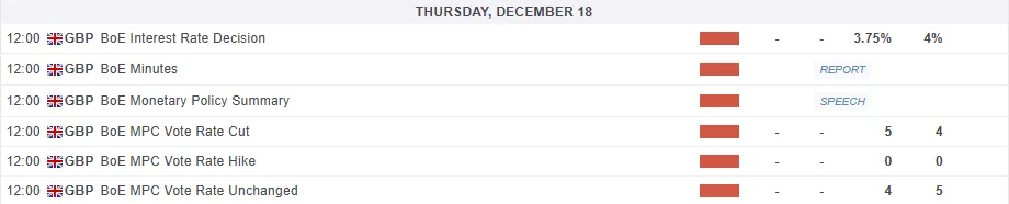 Cuộc họp cuối cùng của Ủy ban MPC năm 2025 của BoE, dự kiến diễn ra vào ngày 18 tháng 12, được tổ chức trong bối cảnh thị trường tài chính gần như chắc chắn rằng một đợt cắt giảm lãi suất vào dịp cuối năm sẽ xảy ra. Sau giai đoạn tạm dừng, BoE được kỳ vọng rộng rãi sẽ tiếp tục chu kỳ nới lỏng, động thái được xem là cần thiết khi nền kinh tế Anh rơi vào trạng thái đình trệ và các tín hiệu giảm phát ngày càng rõ nét.