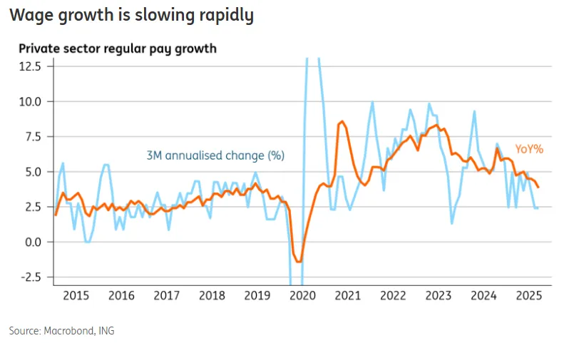 Thị trường lao động cũng có dấu hiệu hạ nhiệt, với tỷ lệ thất nghiệp tăng lên 5%, các khảo sát tuyển dụng duy trì ở mức yếu và tăng trưởng tiền lương, yếu tố then chốt của lạm phát lõi, đang giảm nhanh về vùng dễ kiểm soát hơn.