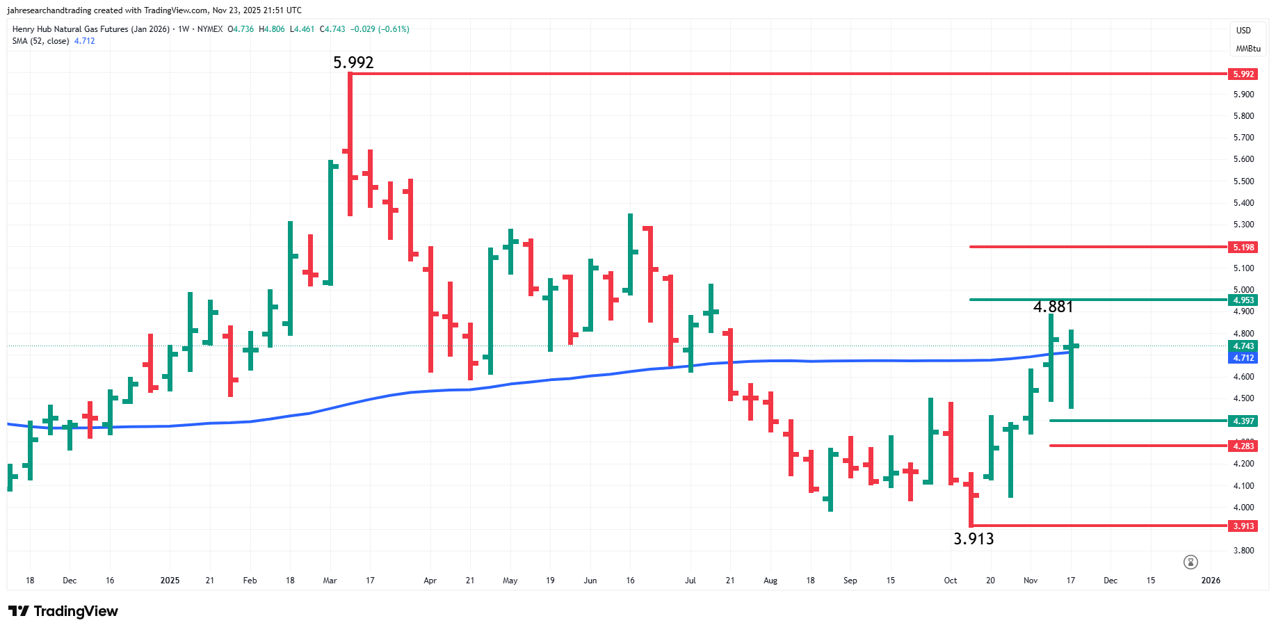 Hợp đồng tương lai khí đốt tự nhiên giảm trong tuần này khi sản lượng kỷ lục và thời tiết ôn hòa trong ngắn hạn lấn át các yếu tố hỗ trợ. Hợp đồng tương lai khí đốt tự nhiên tháng 1 đóng cửa ở $4.743, giảm $0.029 tương đương -0.61%, nhưng vẫn giữ trên đường trung bình động 52 tuần tại $4.712. Việc duy trì phía trên mức pivot kỹ thuật quan trọng này giúp ngăn chặn nguy cơ phá vỡ mạnh, dù thị trường hiện kẹt giữa nguồn cung dồi dào và nhu cầu theo mùa chưa tăng đáng kể.