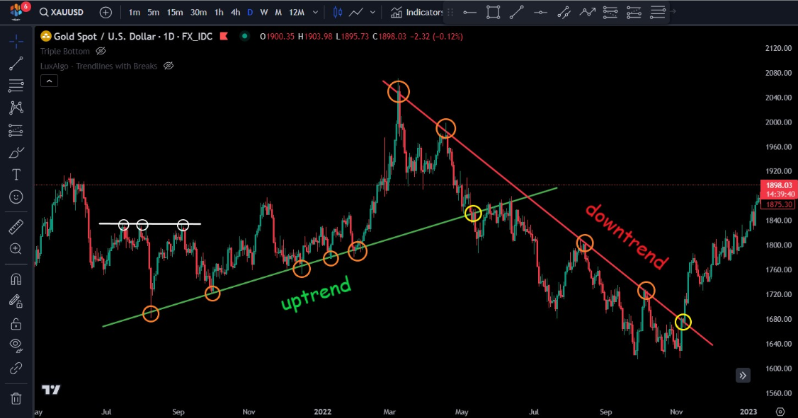 Các đỉnh và đáy này được gọi chung là các điểm tiếp xúc. Càng ít điểm tiếp xúc và đường xu hướng càng dốc thì độ tin cậy càng thấp và khả năng đảo chiều giá càng cao.