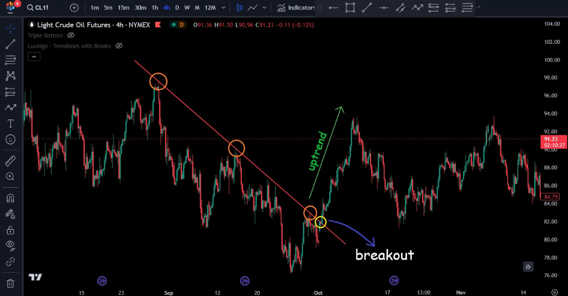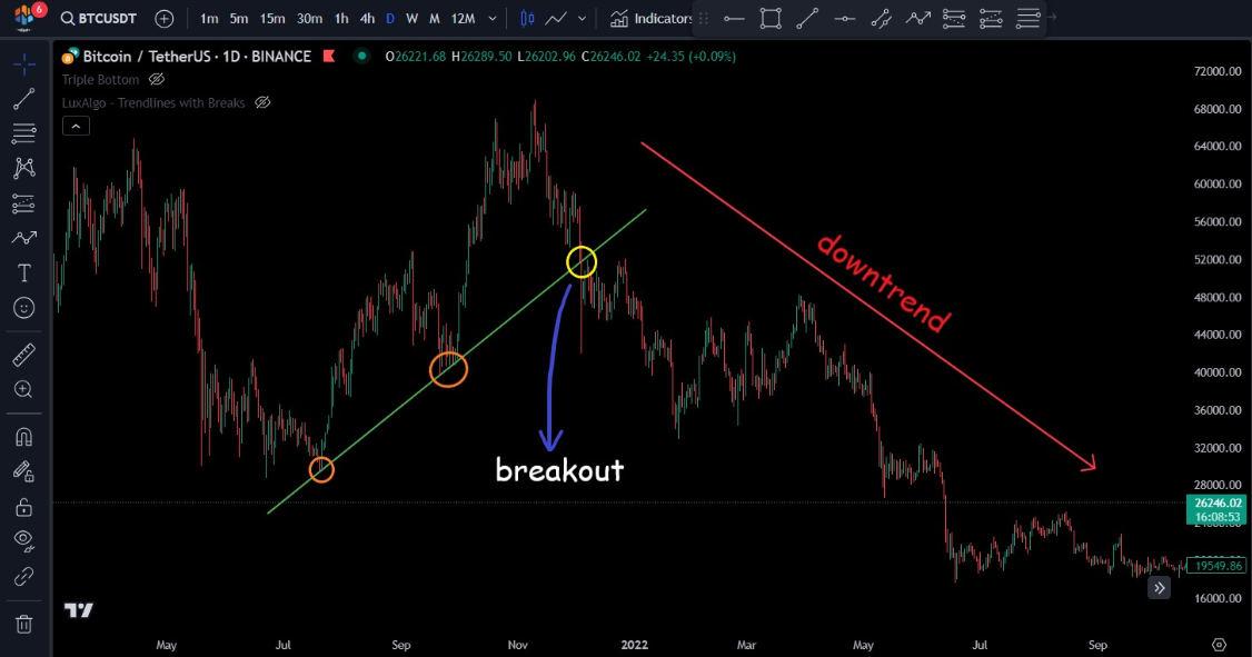 Mặt khác, giá sẽ bật trở lại khi chạm đến đường xu hướng giảm (nối các đỉnh sau thấp hơn đỉnh trước) nên nó hoạt động như một đường hỗ trợ. Tuy nhiên, khi các cây nến phá vỡ vùng hỗ trợ này, xu hướng tăng mới sẽ được hình thành.