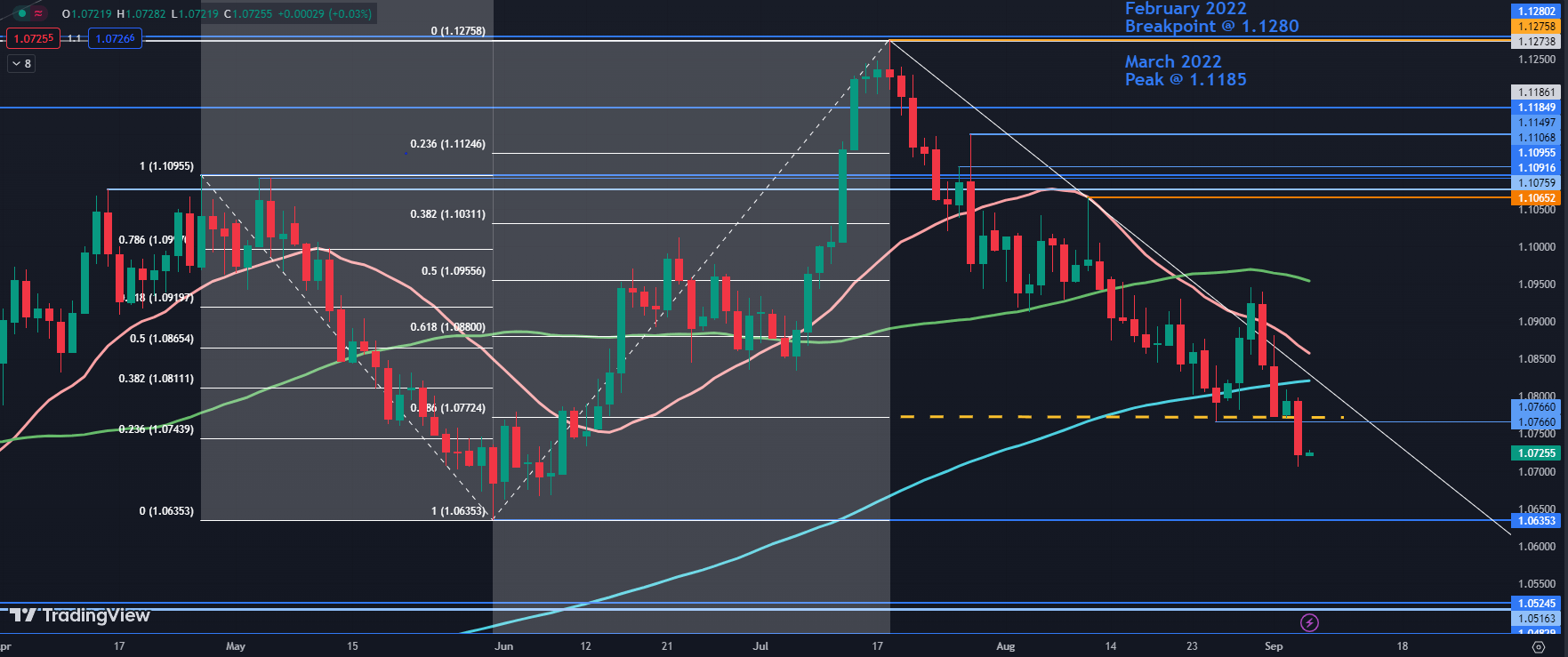 Cao hơn đó, kháng cự có thể nằm ở đỉnh tháng 3 năm 2022 tại 1.1185 hoặc mức đỉnh gần đây tại 1.1275. Nếu vượt qua mức này, mục tiêu tiếp theo có thể nằm tại 1.1380. Ngay phía trên có thêm một số breakpoint khác trong vùng 1.1385 – 95.