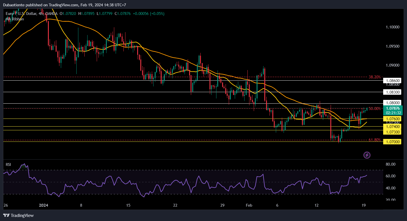 EUR/USD giao dịch quanh 1.0780 và tăng 0.1% trong ngày.