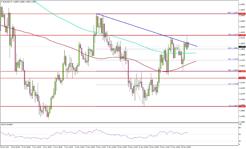 Tuy nhiên, phe bán đang tiếp tục bảo vệ khu vực trên 1.1600. Đồng thời, một đường xu hướng giảm chính đang hình thành với kháng cự trùng tại 1.1600. Rào cản quan trọng đầu tiên nằm tại 1.1610, tương ứng mức thoái lui Fib 76.4% của nhịp giảm từ đỉnh 1.1656 xuống đáy 1.1491.
