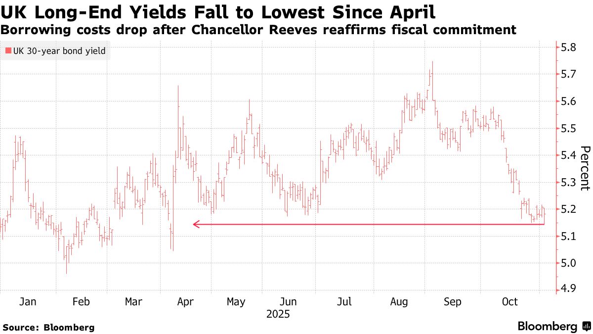 Trái phiếu chính phủ Anh hoạt động mạnh mẽ trong suốt tháng Mười, ghi nhận hiệu suất hàng tháng tốt nhất kể từ cuối năm 2023. Kỳ vọng rằng gói biện pháp được công bố vào cuối tháng này sẽ kìm hãm tăng trưởng đã khiến một số ngân hàng kêu gọi cắt giảm lãi suất ngay trong tuần này.