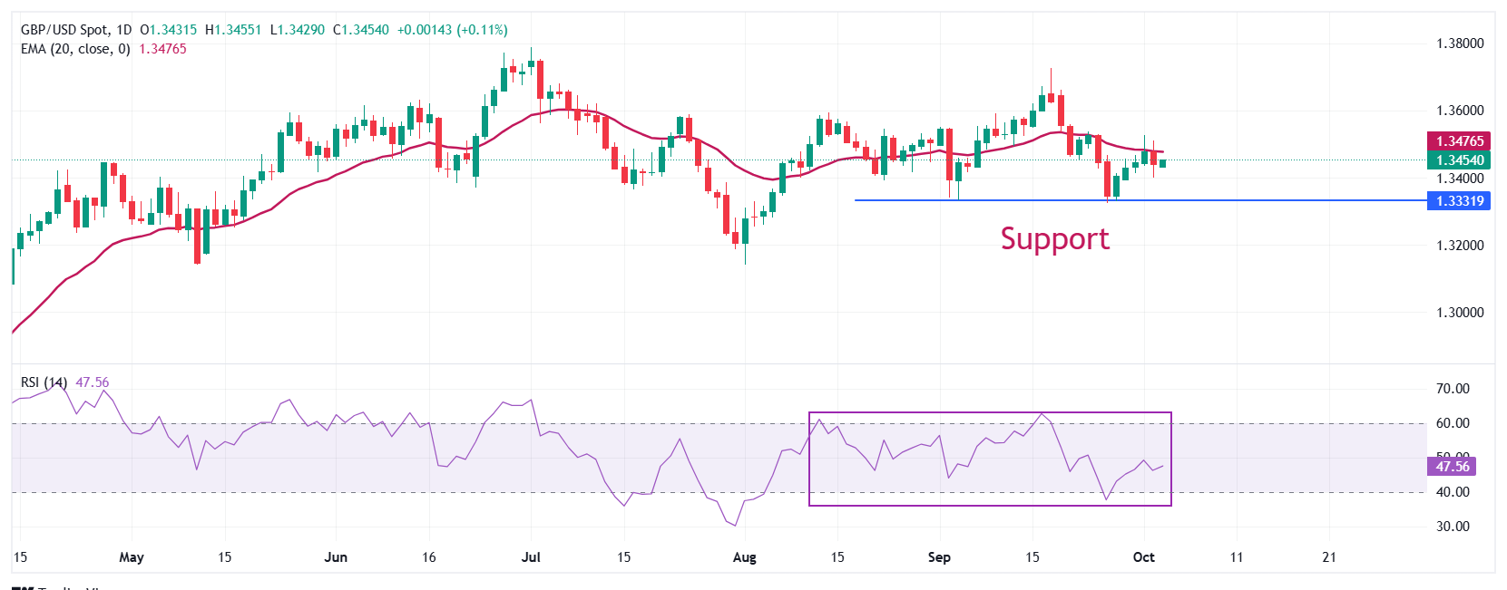Trong ngày thứ Sáu, cặp tiền dao động trong biên độ của ngày trước đó quanh 1.3450. Cặp GBP/USD gặp khó khăn khi cố gắng quay lại trên đường trung bình động hàm mũ 20 ngày (EMA) hiện ở 1.3476.