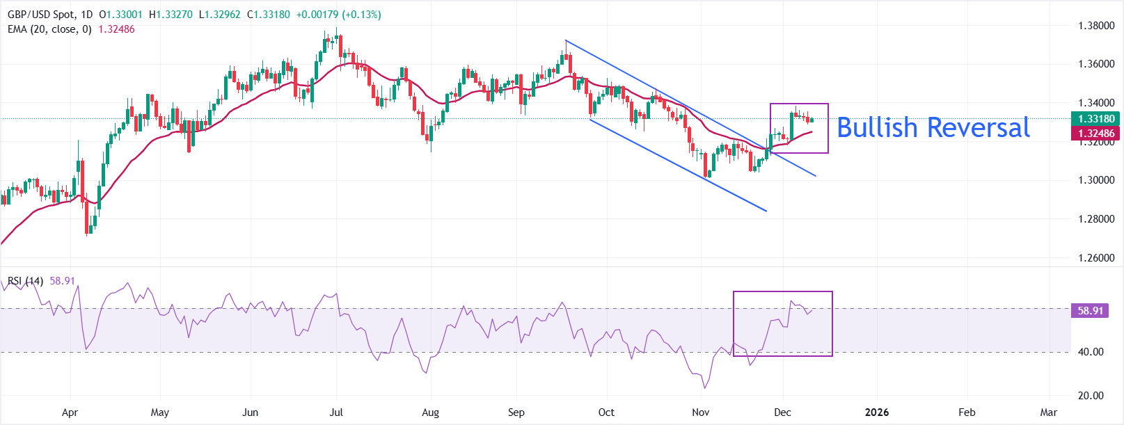 Trên biểu đồ khung ngày, GBP/USD giao dịch tại 1.3318. Giá nằm trên đường EMA 20 ngày đang hướng lên ở mức 1.3249, duy trì xu hướng tăng ngắn hạn. Đường trung bình này đã hướng cao hơn trong những phiên gần đây, cho thấy các nhịp giảm sẽ tìm thấy hỗ trợ động quanh khu vực đó. Một đường xu hướng giảm từ mức 1.3726 (đỉnh ngày 17 tháng 9) đã bị phá vỡ tại 1.3026, loại bỏ áp lực từ phía bán và củng cố xu hướng tăng.