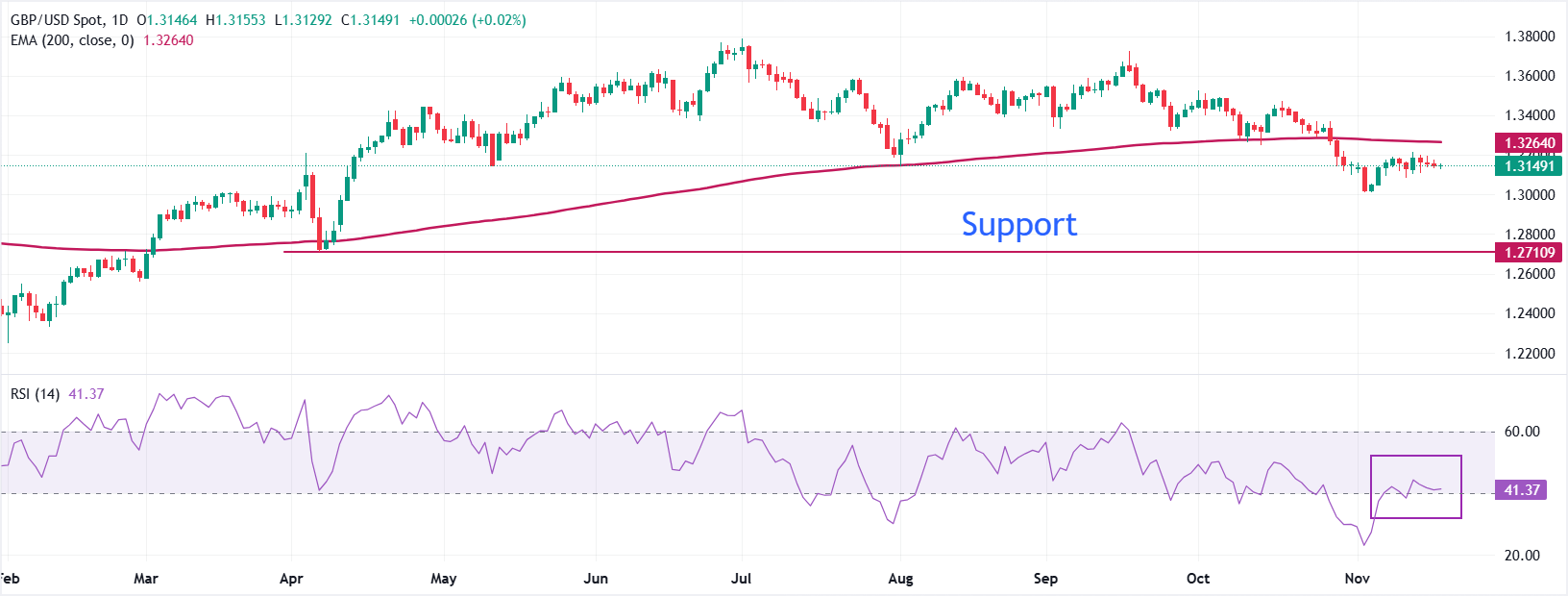 GBP/USD giao dịch đi ngang rộng quanh 1.3150 vào thứ Tư. Xu hướng tổng thể của GBP/USD vẫn giảm khi nó nằm dưới EMA 200 ngày tại khoảng 1.3264.