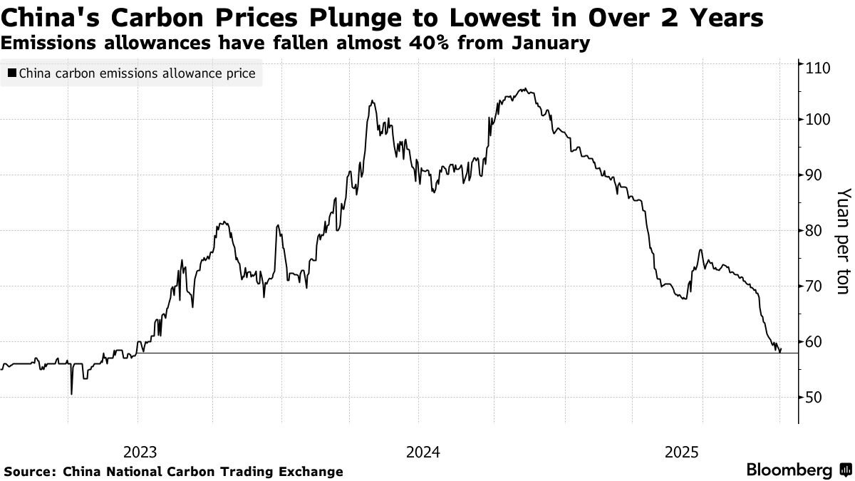 Giá tín chỉ carbon của Trung Quốc đã ở mức thấp nhất trong hơn hai năm qua khi các quy định về chuyển tiếp của quốc gia này kích hoạt làn sóng bán tháo.