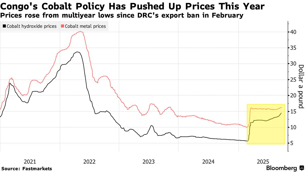 Congo đã sản xuất gần 220,000 tấn cobalt trong năm 2024, theo nhà kinh doanh chuyên ngành Darton Commodities. Nó chiếm khoảng ba phần tư sản lượng toàn cầu. Lệnh cấm xuất khẩu của quốc gia này được công bố lần đầu tiên vào tháng Hai, và sau đó được gia hạn vào tháng Sáu thêm ba tháng nữa. Quyết định này đến sau sự sụt giảm giá cobalt khi CMOC Group Ltd. của Trung Quốc tăng cường sản xuất tại hai mỏ lớn ở quốc gia Trung Phi này.