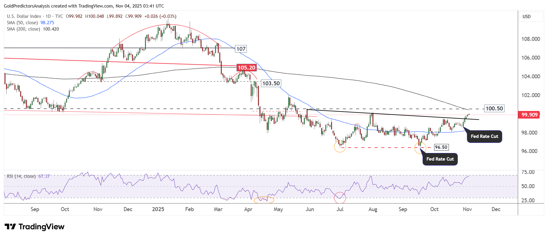 Biểu đồ ngày cho thấy chỉ số USD duy trì đà tăng sau các đợt cắt giảm lãi suất gần đây của Fed. Mức kháng cự quan trọng nằm quanh 100.50, trùng với đường SMA 50 ngày. Việc vượt qua vùng này có thể xác nhận động lực tăng ngắn hạn cho đồng bạc xanh.