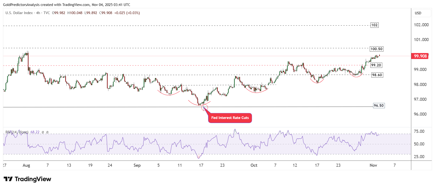 Trên khung 4 giờ, chỉ số USD phục hồi mạnh từ vùng hỗ trợ 96.50 sau đợt cắt giảm lãi suất của Fed, nhưng hiện đang tiếp cận vùng kháng cự quan trọng 100.50. Khả năng điều chỉnh từ vùng 100.50–101 là tương đối cao, có thể khiến chỉ số tiếp tục dao động trong biên độ rộng. Dù có sự phục hồi gần đây, xu hướng trung hạn của chỉ số USD vẫn mang sắc thái giảm giá.