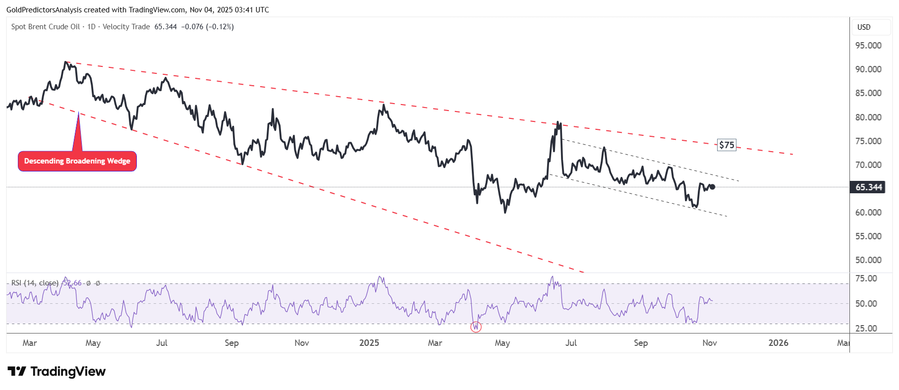 Trên biểu đồ ngày, dầu Brent vẫn nằm trong mô hình cái loa giảm hình thành từ năm 2024. Vùng kháng cự mạnh vẫn được xác định quanh 75 USD, và việc phá vỡ rõ ràng trên mức này là cần thiết để xác nhận xu hướng tăng mới.