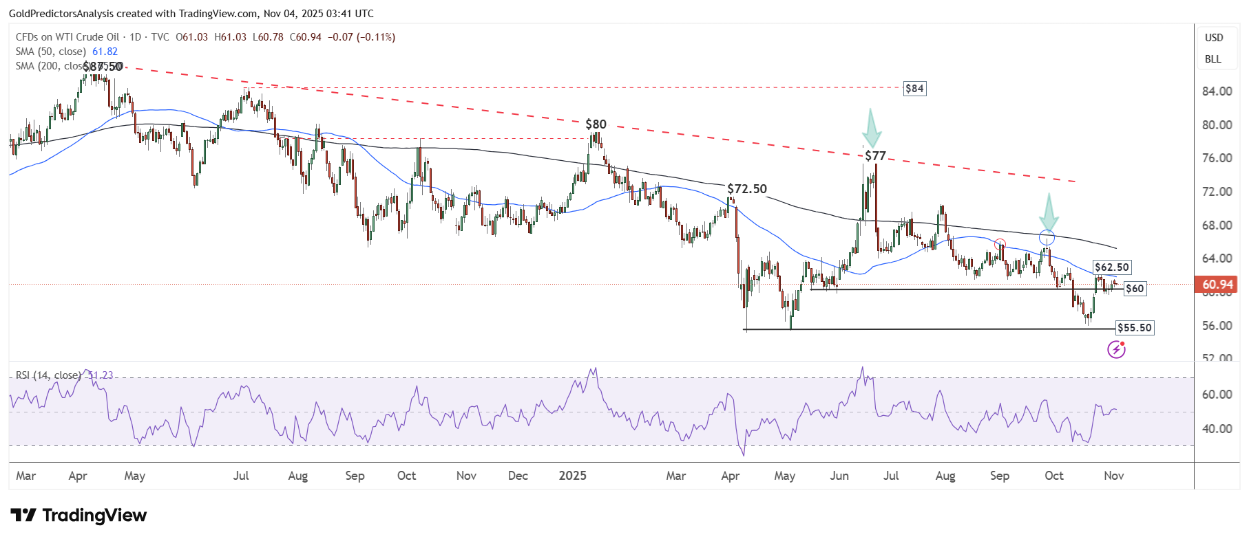 Biểu đồ hàng ngày cho thấy dầu WTI tiếp tục dao động trong vùng hẹp dưới đường SMA 50 ngày, quanh khu vực 60–62 USD sau khi bật lên từ vùng hỗ trợ 55 USD. Giai đoạn đi ngang này phản ánh tâm lý chờ đợi của thị trường khi nhà đầu tư tìm kiếm hướng đi mới.